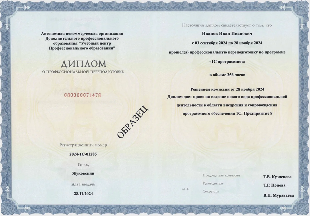 Удаленная работаПо окончании обучения выдается диплом о повышении квалификации, зарегистрированное установленным порядком в государственной системе учета документов об образовании ФИС ФРДО. Документ является бланком строгой отчетности, подтверждает получение новых компетенций в области программирования на платформе 1С, дает право вести профессиональную деятельность по специальности.